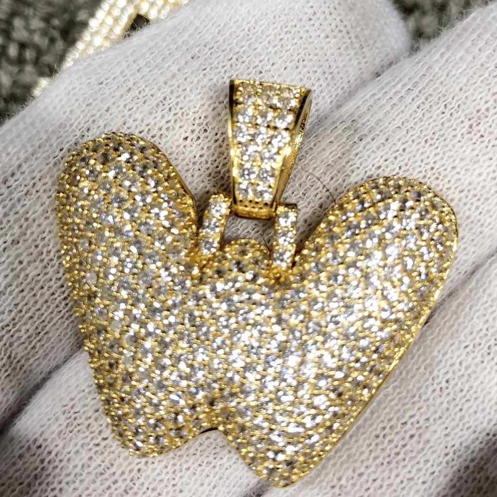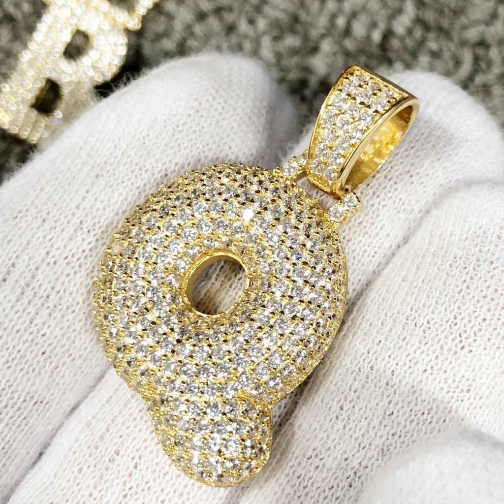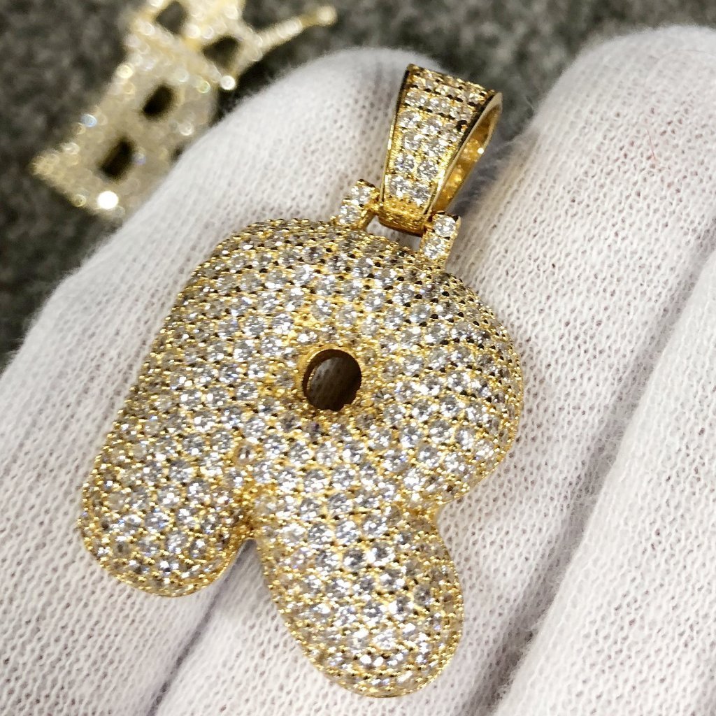 Custom Bubble Initial Bling Bling Pendants from A-Z. Popular for 2018, Bubble Initials have been the newest trend in hip hop jewelry fashion. Our custom Made Bubble Initials crafted from fine .925 Sterling Silver and 18K Yellow Gold Wrapped to give you the look and feel of solid gold at a fraction of the cost. Stones are top of the line simulated diamond that look and shine like real diamonds. Stones are prong set by hand with precision. Looks like a custom made diamond Bubble Letter that costs thousands of dollars! Get your bubble letters made in Real .925 Sterling Silver here for the price of alloy metal elsewhere.