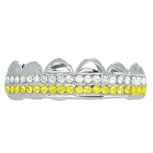 Bling Bling Grillz for your Upper Top row of Teeth Canary yellow Ice platinum tone double iced out Hip Hop Grillz with the new and improved silicone fitting piece for added comfort. This new color stone grillz styles feature a combination of clear ice with ruby red ice, sapphire blue ice, or canary yellow ice on your hiphop grillz. This grill is constructed from a high quality solid brass core and heavily plated rhodium finish to give this grille a brilliant shine. Each high quality fake diamond is hand glued into the hiphop grillz for maximum bling. Each grille can fit any teeth no matter how straight or crooked your tooth is. Thanks to our special custom fitting silicone mold mouth piece there is no need to send a mold back and forth through the mail. Easy to follow instructions are included to wear your mouth grillz in minutes! The good thing about these grills is that they are removable, you can wear the grill or remove it easily. Grillz come in a nice box to store in. **Disclaimer** These grillz are intended for decoration and entertainment purpose only. The grillz are not intended for eating. These products are sold as it is without warranties of any kind. Due to the nature of this product, no returns or exchanges are allowed so please be aware of that prior to ordering. We will not be liable for any damages of any kind arising from the use of these grillz including but not limited to incidental, punitive or accidental damages.