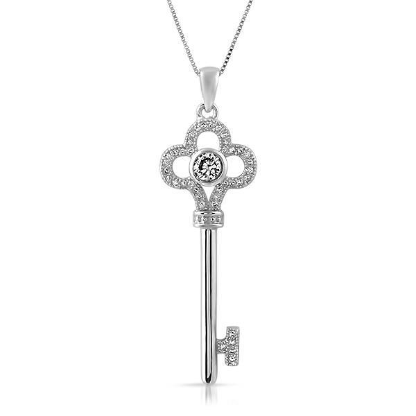 Clover Key .925 Sterling Silver Charm Pendant. This finely crafted key is made of solid .925 Sterling Silver and plated with rhodium to give it a platinum look. This Key pendant is covered in CZ stones all of which have been hand set with prongs to look and feel like fine diamond jewelry. Incredible detailed jewelry offered at an amazing price. Order your .925 sterling silver key pendant now.