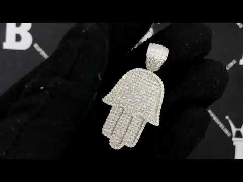 Hamsa 3.20 Carat VVS Moissanite Pendant .925 Sterling Silver.  This iced out Moissanite Pendant is simply breathtaking and displays an incredible bling bling shine.  We insisted on using the finest Moissanite stones available to craft this perfect high end 'diamond' bling bling Moissanite Micro Pave Charm.  Moissanite stones are carbon based stones just like real Diamonds.  The benefit of our Moissanite hip hop jewelry is that you get a better shine for much less money than genuine Diamonds.  Our Moissanite Stones have a higher refractive index than real Diamonds and rank 9-9.5 on Mohs hardness scale.