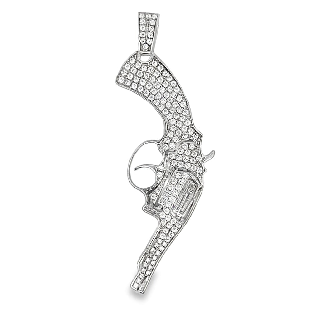 Handgun Revolver CZ Pendant .925 Sterling Silver.  Quality crafted hip hop bling pendant.  Crafted from fine .925 Sterling Silver and wrapped to look and feel like solid Gold at a fraction of the cost.  Prong set CZ Cubic Zirconia stones, set with precision gives this iced out pendant a beautiful and bright bling bling shine.  A must have in your hip hop jewelry collection.
