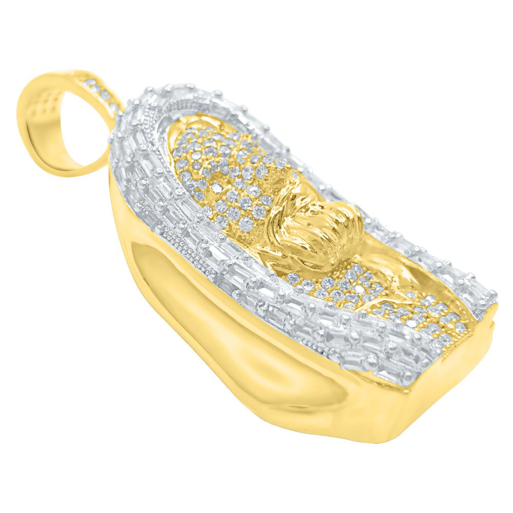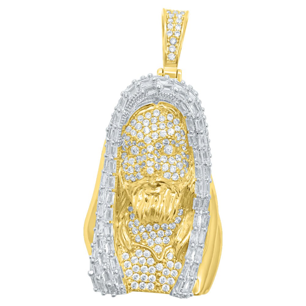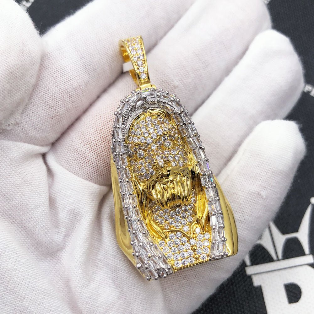 Jesus Bust Baguette CZ Hip Hop Iced Out Pendant.  Limited Edition Iced Out Hip Hop Pendant.  Finely crafted with intricate details and stone setting.  Stones are VVS Simulated Diamonds Prong Set, the same way genuine diamond hip hop jewelry is made.  Stand out from the crowd with this this detailed quality made iced out pendant.