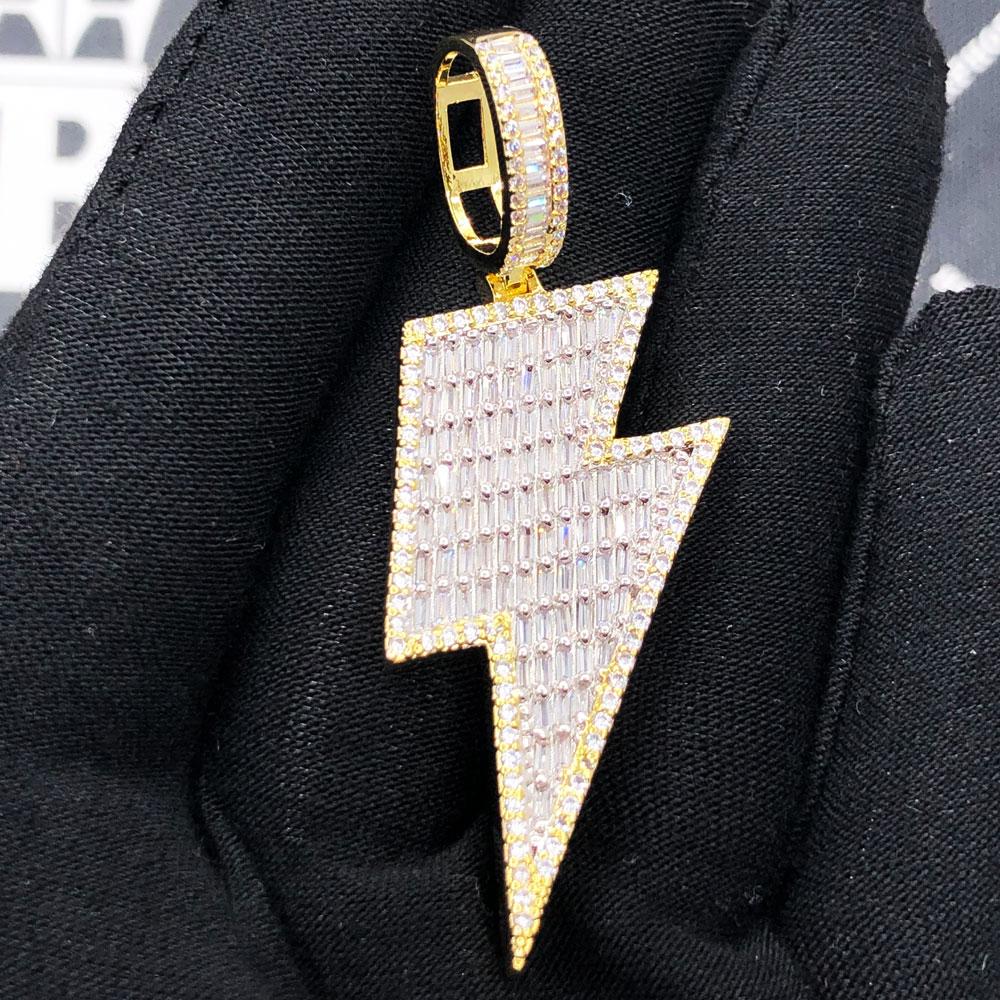 Lightning Bolt Baguette VVS CZ Hip Hop Iced Out Pendant. Limited Edition Iced Out Hip Hop Pendant. Stones are VVS Simulated Diamonds Prong Set, the same way genuine diamond hip hop jewelry is made. Stand out from the crowd with this this detailed quality made iced out pendant.