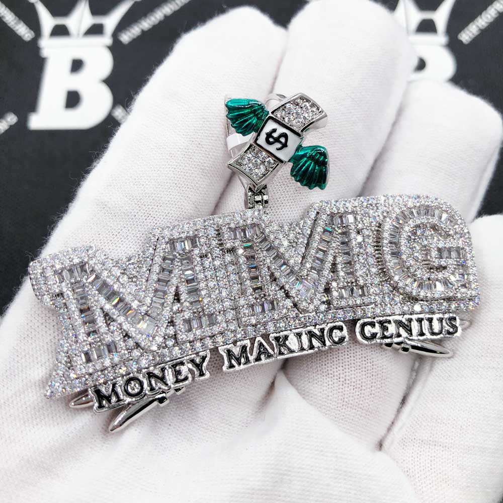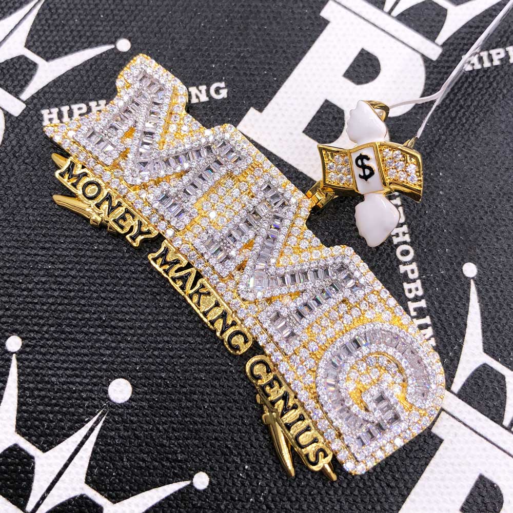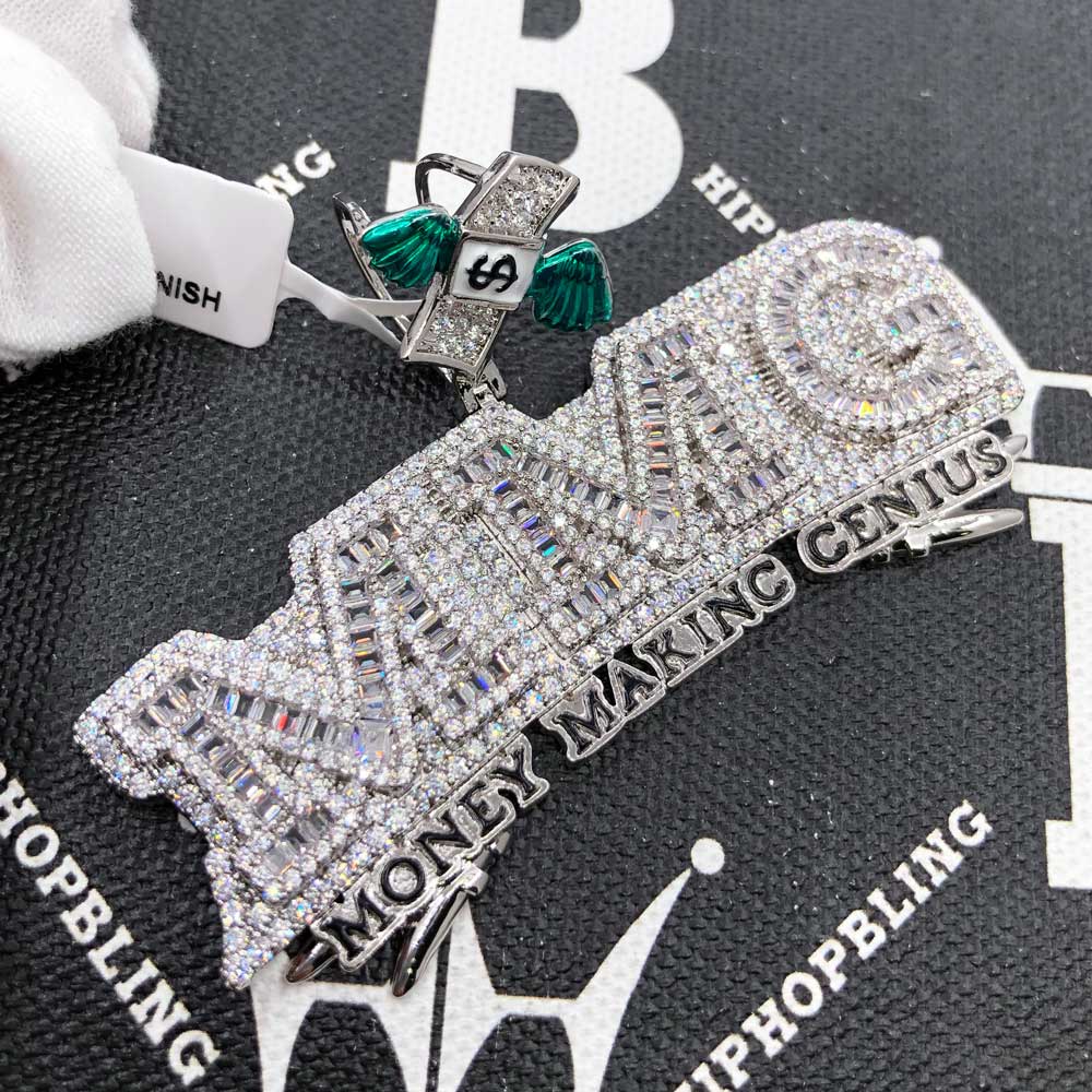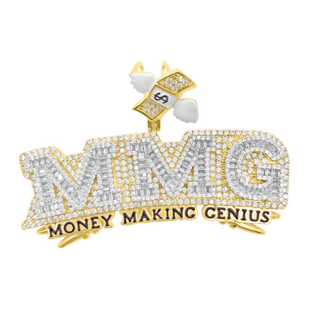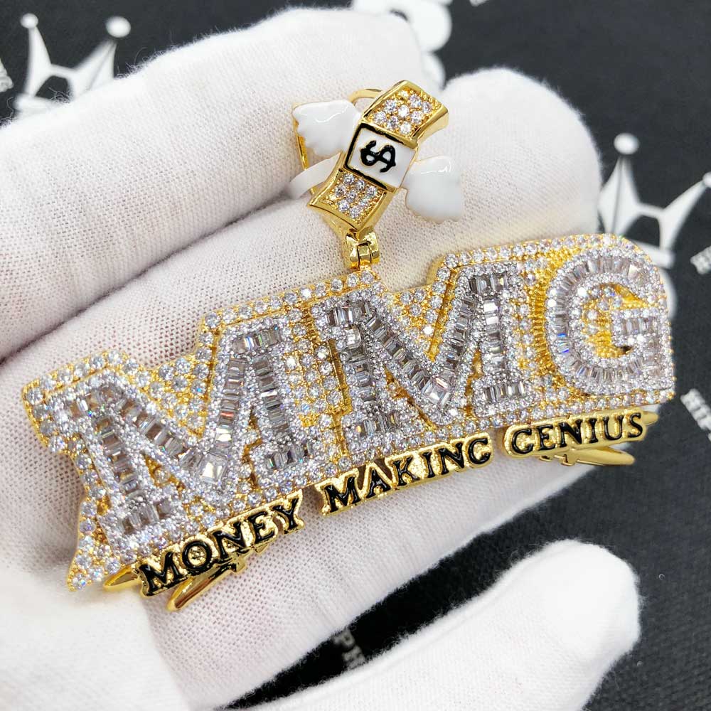 MMG Money Making Genius CZ Hip Hop Iced Out Pendant. Limited Edition Iced Out Hip Hop Pendant. Finely crafted with intricate details and stone setting. Stones are VVS Simulated Diamonds Prong Set, the same way genuine diamond hip hop jewelry is made. Stand out from the crowd with this this detailed quality made iced out pendant.