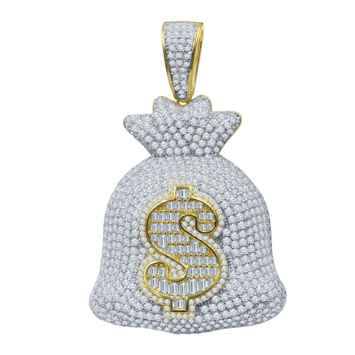 Money Bag Baguette $ VVS CZ Iced Out Pendant .925 Sterling Silver. Crafted from Solid .925 Sterling Silver with an incredible bling bling shine. Limited Edition Iced Out Hip Hop Pendant. Stones are VVS Simulated Diamonds Prong Set, the same way genuine diamond hip hop jewelry is made. Stand out from the crowd with this this detailed quality made iced out pendant.
