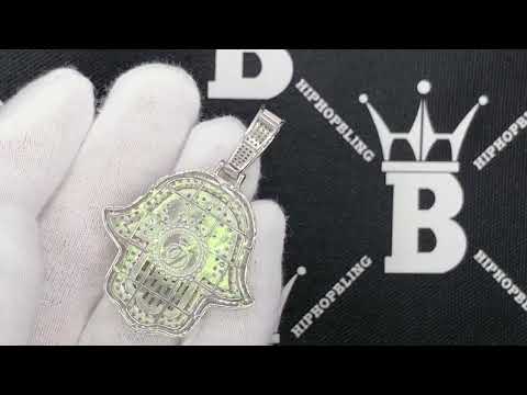 Star Hamsa Baguette VVS Moissanite Pendant 5.39cttw .925 Sterling Silver.  This iced out Moissanite Pendant is simply breathtaking and displays an incredible bling bling shine.  We insisted on using the finest Moissanite stones available to craft this perfect high end 'diamond' bling bling Moissanite Micro Pave Charm.  Moissanite stones are carbon based stones just like real Diamonds.  The benefit of our Moissanite hip hop jewelry is that you get a better shine for much less money than genuine Diamonds.  Our Moissanite Stones have a higher refractive index than real Diamonds and rank 9-9.5 on Mohs hardness scale.